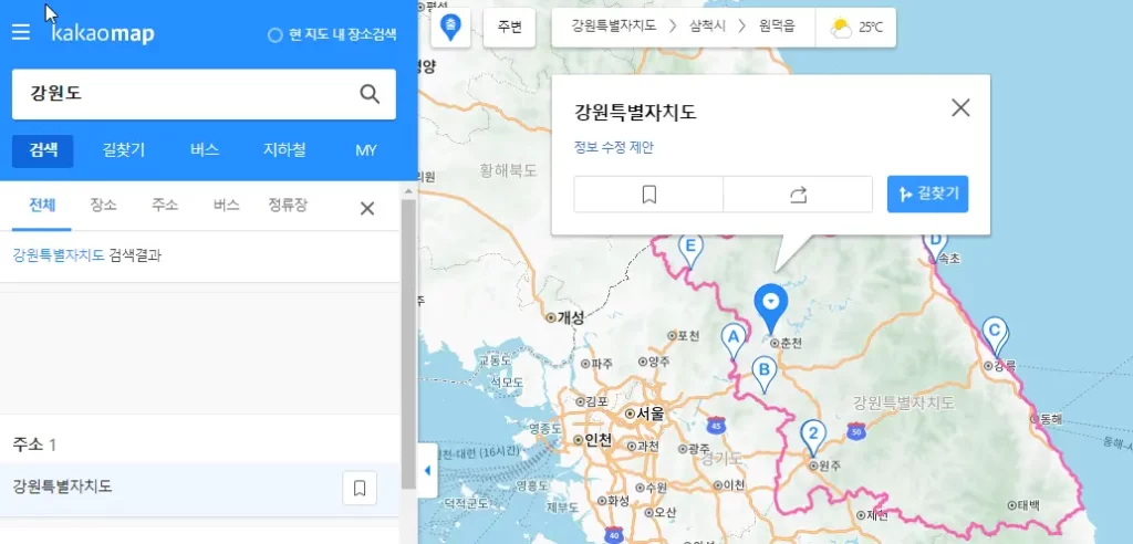 - 인터넷 검색 엔진에서 ‘강원도 지도’를 검색하면, 여러 웹사이트에서 강원도의 지도를 제공합니다. 예를 들어 다음에서 ‘강원도 지도’를 검색하면, 카카오맵을 기반으로 강원도의 전체적인 모습을 보실 수 있습니다. 이러한 서비스는 네이버 지도나 구글지도와 같은 지도서비스도 이용가능하며, 확대/축소/이동 기능으로 크게보기도 됩니다.